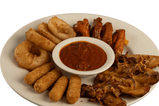 Potato Skins, Buffalo Wings, Mozzarella Sticks and Onion Rings
