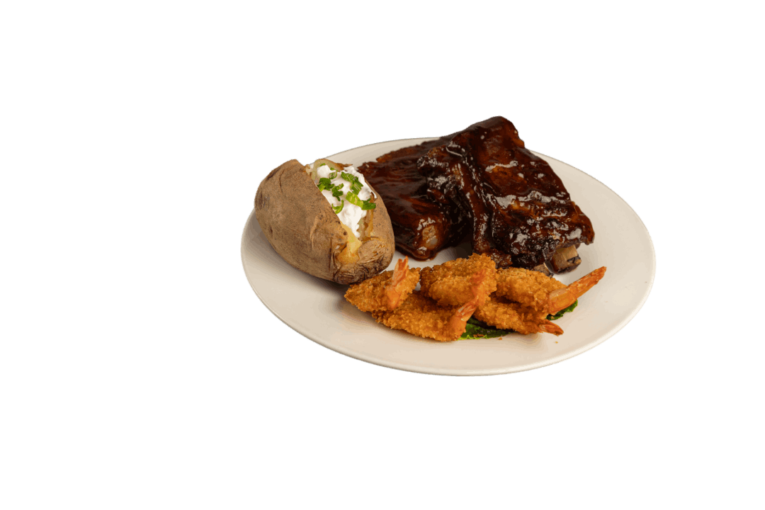 A hearty platter of ribs smothered in BBQ sauce and golden fried shrimp. Add a 4 oz juicy sirloin steak.