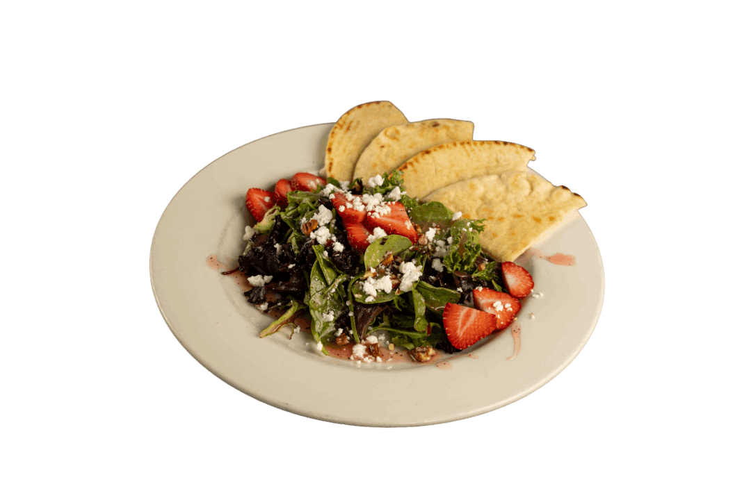 Delicious and beautiful! A mix of fresh baby field greens with strawberries, cranberries, pecans, and feta cheese. Tossed with our low-fat raspberry vinaigrette dressing and serviced with pita bread.