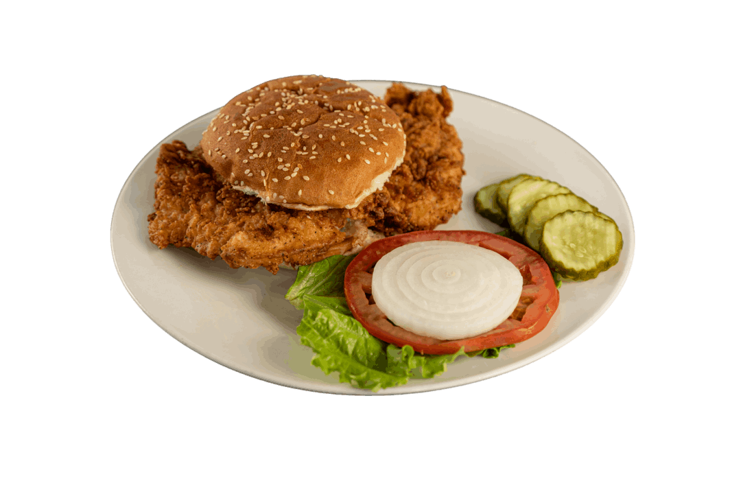 An Ozarks favorite!! A large, hand-breaded pork tenderloin topped with lettuce, tomatoes, onions, pickles and mayo